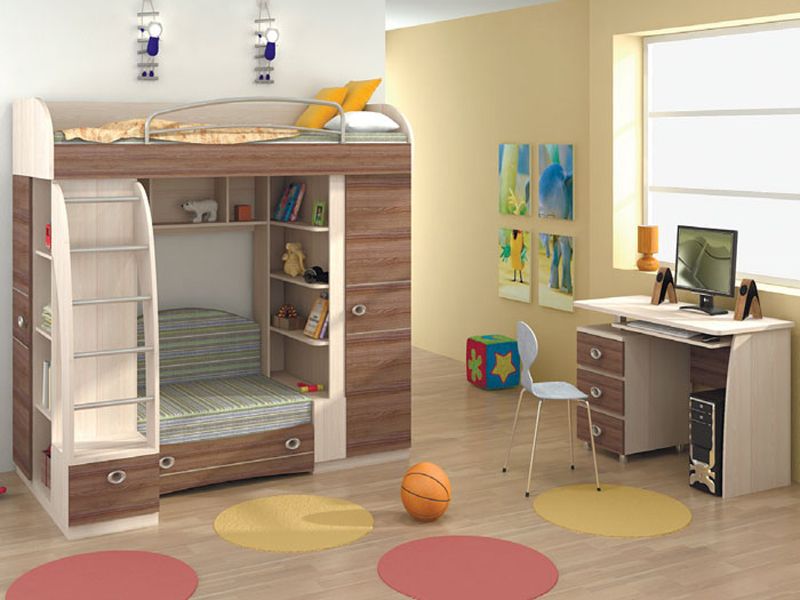 Трансформируемое спальное место на нижнем ярусе: 1000 х 1900 мм. Матрас из ППУ располагается на реечном основании (латах) и снабжен чехлами на молниях.