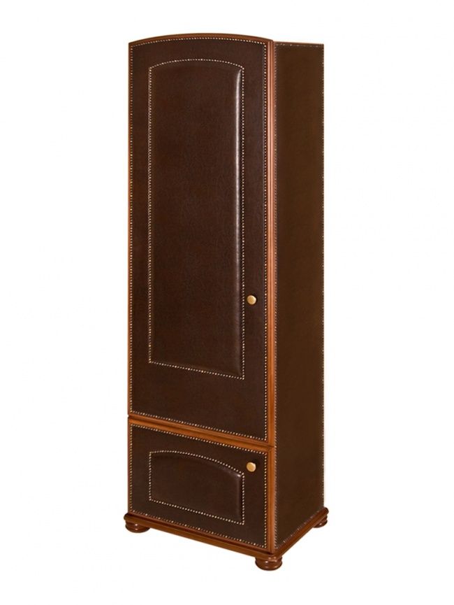 Шкаф с двумя отделениями. Верхнее отделение: полка для головных уборов и штанга для верхней одежды. Нижнее отделение: две полки для обуви. Открывание дверей левое и правое. Отделка экокожа молдинг. Фурнитура компании "BRASS", Испания (латунь).