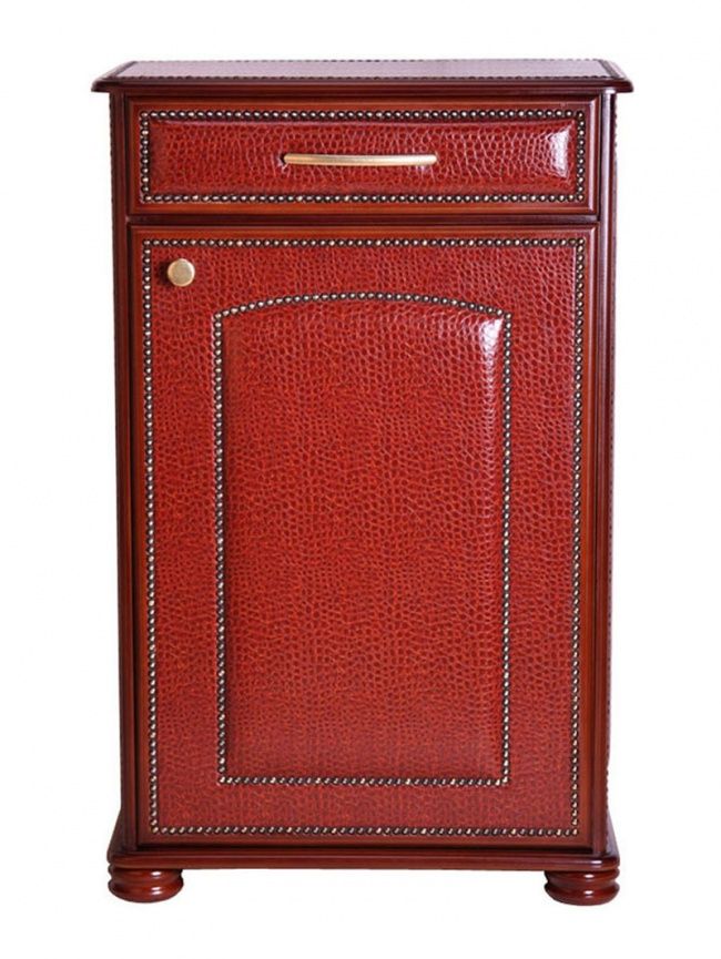 Тумба с верхним выдвижным ящиком и одной распашной дверцей, внутри три полки. Открывание двери левое и правое. Отделка экокожа молдинг. Предлагается в комплекте с зеркалом Парма-1 или зеркалом Парма-1/1. Ножки точеный бук, фурнитура компании "BRASS" Испания (латунь).