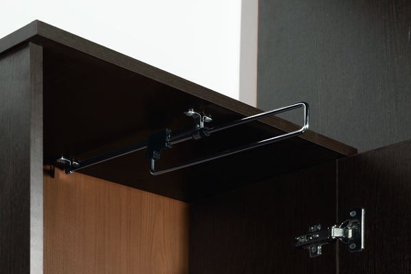 Небольшой по размерам многофункциональный шкаф с выдвижной штангой, который имеет все необходимое для прихожей. Модель установлена на металлические опоры, не регулируемые по высоте.