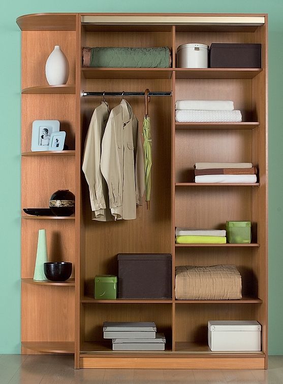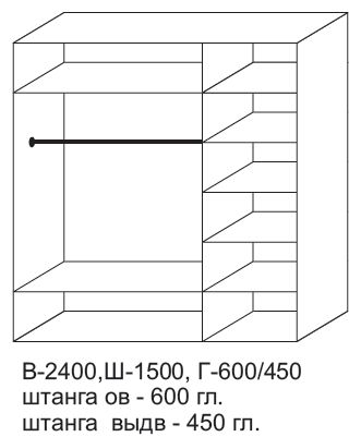 - разделен на две секции: за одной дверью-купе ниша с антресольной и нижней полками, штанга;